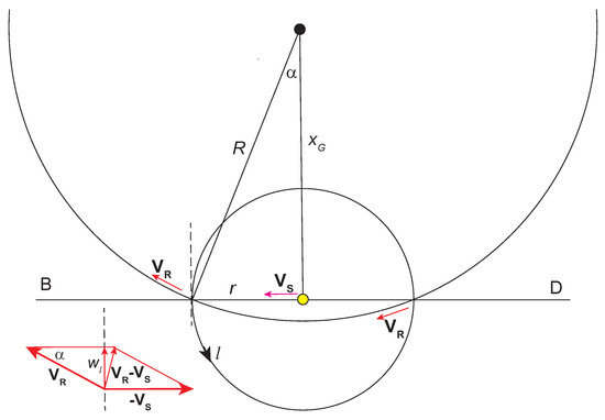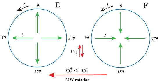 The important result is shown in Figure 15. The asymmetry of histograms and in sectors E and F with the white areas reflects different projections of the asymmetry represented by Equation (53). The yellow–orange region at corresponds to the peaks in Figure 14E,F, which are the integrals of the histograms over l. The shape of histograms can be explained using Figure 16. Distributions of for are controlled by the parameters . Their connection with and can be deduced from the figure. At the directions of and the MW rotation are identical, so . But at , the two directions are opposite, so . At , the situation is a little more complicated. If or are small (which is almost our case, see panels E,F in Figure 3, where r), then the direction can be approximated by vector , so , similarly for distributions controlled by the parameters , which are also related to and . Also here, the agreement between the data and the model is very good. Clear evidence for our explanation was provided by the MC simulation: after setting the symmetric , the asymmetry in the figure disappears.