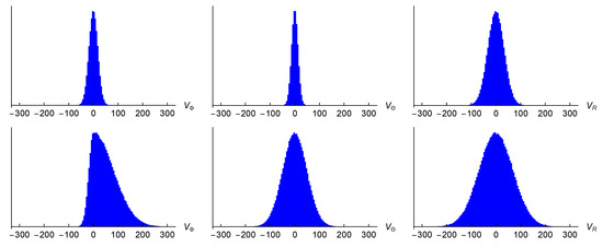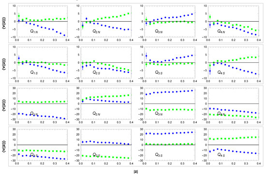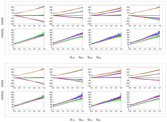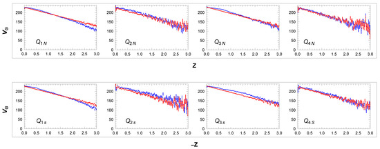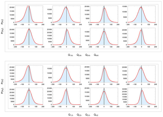 Correct Monte Carlo parameter settings can be verified in wide Q-sectors outside the area of the galactic plane. Figure 17 shows the dependence of mean values and dispersions of velocity distributions in these sectors. The curves together with the corresponding overall distributions of velocities in broad sectors and in Figure 18 again confirm the very good agreement of the simulation with data. Note in particular the projections in sectors ,,, and and in sectors ,,, and . This is also due to the asymmetry expressed in Equation (53) that occurs for , as illustrated by the simulated distribution in Figure 13. Note also the expected symmetry between the corresponding and panels in Figure 18.