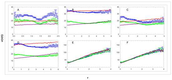 Figure 12 shows the corresponding velocity dispersion dependencies. In the upper panels A–D, we again observe fluctuations that are not present in the simulation. In panels E,F with a coarser scale, the fluctuations are not noticeable, and agreement with the simulation is very good. Averaged data in panels B-D do not contradict the simulation. The difference between data and simulation in panel A is more obvious and will be analysed below.