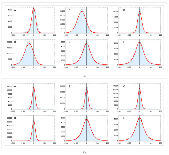 Distributions of and in sectors (A–F): data (light blue) and simulation model (red). Unit: v[km/s]. Binning: 1.6 km/s.