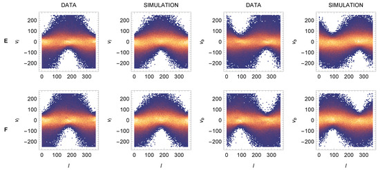(3) These distributions obtained from the input data and simulations will now be compared. The comparison in Figure 7 shows overall very good agreement between data and simulation for panels B,D,E,F. In panels A and C, the simulation model does not reproduce local kinematic substructures generating deviations km/s. The presence of these substructures shows the precision with which we work. At the same time, the fluctuations are not noticeable in the other panels because their velocity scale is coarser.