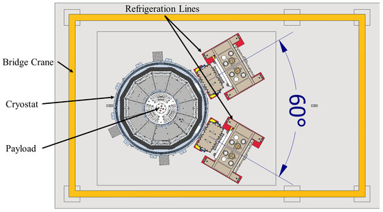 Four PT cryocoolers are employed to cool down the setup. They will be located on the two refrigeration lines (see Figure 1 and Figure 2), which will supply the cooling power to both the cryostat and the payload. In particular, one of the refrigeration lines is assigned to the cooling of the innermost radiation shield of the cryostat, while the other is entirely dedicated to the cooling of the payload. We remark that the label C75 was introduced to specify that the cryostat we are developing does not reach the full size () envisaged for ET (estimated). However, the full-scale payload could in principle be tested. This is possible because we are limiting the purpose of the facility just to the payload development, and several features related to the seismic isolation system and to the interferometer are absent.