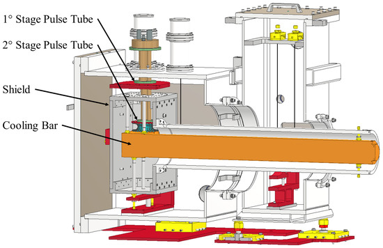 To achieve this, each refrigeration line comprises two suspended stages: a cylindrical radiation shield thermally connected to the first stages of the PTs and a cold cooling bar connected to their second stages. A sectional view is shown in Figure 3 and Figure 4. The radiation shield is constructed from aluminum series 1000, while the cooling bar is composed of aluminum 5N5 (99.9995 % purity).