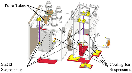 The cooling of the payload is performed through four Pulse Tube cryocoolers (Bluefors Syracuse, Syracuse, NY, USA) The refrigeration line accountable for the cooling of the cryostat shield will locate two Pulse Tube PT420 (certified performance W@ K with 50 W@45 K). The other refrigeration line will employ two Pulse Tube PT425 devices (certified performance W@ K with 50 W@45 K) [6]. These were chosen to cool down the payload because of their higher refrigeration power. These refrigerators were chosen since they lack moving parts at the cold end, making them ideal for low-vibration cryogenic experiments. However, they exhibit a vibrational peak at 1.4 Hz (with harmonics), clearly evident near the device. In order to reduce the impact of vibrations, PTs should be mechanically decoupled from the heat extraction path. This is the reason why we will employ soft heat links that are designed to mitigate vibrations but also thermally connect the system. Moreover, the two refrigeration lines were designed to locate the cryocoolers far from the cryostat and to damp the related vibrations.