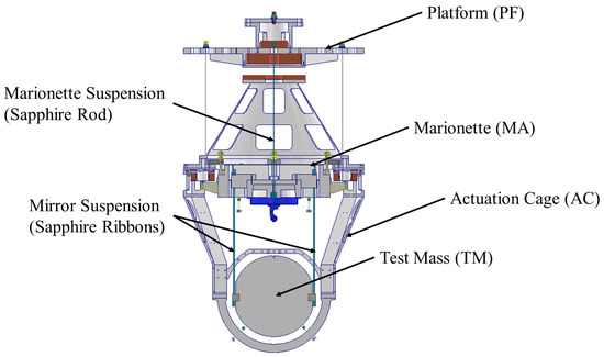 The payload (Figure 6) consists of a top platform, which is the first mass suspended by the TTC. From there, a sapphire rod is used to suspend the marionette. The mirror is suspended from the marionette using four sapphire ribbon-shaped suspensions, as is explained further in this Section. From the platform, three wires are used to suspend the actuation cage, which surrounds the marionette and the mirror. On the AC, several coils are mounted to move and actuate the mirror and the marionette while suspended; furthermore, it is equipped with PEEK stops, which act as a failsafe in case of failures and to assist with the mounting. The materials used for the components are Al 5083 (which shows a higher quality factor with respect to other aluminum series) and copper (which is mainly used to adjust the center of mass of the entire payload). The prototype has been developed with a dummy aluminum mirror (500 mm in diameter and 200 mm in thickness). In order to match the weight of its sapphire counterpart, several copper inserts have been envisaged in the body of the mirror. This enables the prototype and the entire facility to host a sapphire mirror in future tests maintaining the design. The mirror’s target temperature is approximately 20 K, where sapphire exhibits a thermal conductivity peak over 10,000 W/m/K [10]. In ET-LF, this requirement enables extracting the heat absorbed by the TM due to the laser in the cavity and to avoid the formation of thermal gradients on the mirror surface. In the ARC prototype, the expected ET-LF heat input will be reproduced through heaters on the dummy aluminum mirror. In order to obtain the target temperature, the heat extraction path from the mirror to the cooling line should be well designed. In our scheme, the heat is extracted from the mirror via four sapphire ribbons, and then, from the marionette above, a sapphire rod will thermally connect the platform. Al 6N soft braids connect the platform to the AC and subsequently to the refrigeration line’s cooling bar, ensuring efficient heat transfer.