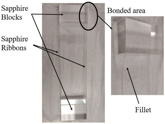 A ribbon geometry solution was chosen for TM suspensions since it is potentially interesting for enhancing the dilution factor. As demonstrated in [11], dissipation dilution is greater by a factor of about 2 for rectangular crystalline silicon ribbons as compared to circular fibers at equivalent temperatures. The solution might also be explored for sapphire. The idea is to use Hydro-Catalysis Bonding (HCB) between two blocks of sapphire ( mm) and two ribbons, shaped with a fillet meant to reduce the transversal degrees of freedom. Currently, preliminary tests of HCB-bonded suspension units have been performed on reduced-scale ribbons, 200 mm in length (see Figure 8). The initial shape adopted for the ribbons will be 1 mm thick, 7 mm wide, and 800 mm in length. The installation concept of the ribbon suspension unit enabled by this new design could prove to be very effective and innovative.