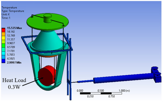 - The steady-state temperature of the mirror: The target temperature of the mirror has been simulated considering the laser heat input (i.e., the heat input baseline of the ET-LF configuration) and all the heat input coming from the openings of the ITS (total of 0.3 W). The simulation result can be seen in Figure 9: the mirror steady-state temperature obtained is ∼15 K. This temperature is intentionally set lower than the target one in order to compensate for possible real effects, such as unpredictable heat loads and contact resistances in the heat links. In the simulation, the ITS temperature has been considered as the target one (15 K).