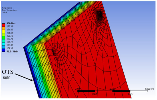 Results of steady-state thermal simulation of the RML approach on one of the lateral surfaces of OTS. A heat load of 1.6 W/m2 resulted in 15 layers of RML and a target temperature of OTS of 80 K.