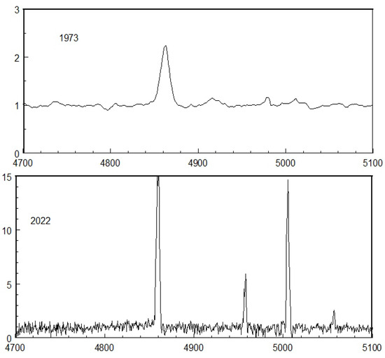 The spectrograph was upgraded in 2001, the image-tube was replaced by a CCD camera ST-8 (1530 × 1020), and then after 2017, by a CCD camera STT-3200 (2184 × 1472). The modern spectrograms are obtained in two wavelength ranges: 4400–5200 Å and 6300–7300 Å with a dispersion of 1.0 Å/pixel. For the entrance slit of the spectrograph 7″–10″, the resolution is 1200–900 in two spectral ranges, correspondingly. Spectra of standard stars from [9], obtained just before or after the target, were used for the flux calibration. Obtained data were reduced in the standard way: dark subtraction and flat fielding. All results were corrected for atmospheric extinction and spectral sensitivity of equipment. In 2020–2023, three spectrograms were obtained at the 1.5 m telescope AZT-20 of FAI. Its innovative spectrograph was equipped with the Volume Phase Holographic Gratings and CCD camera EMCCD. All observations were provided in weather conditions suitable for flux calibration. Typical seeing for AZT-8 was 2–3 arcsec in 1970–1990, and later, 4–5 arcsec. For AZT-20, seeing is 1–2 arcsec.