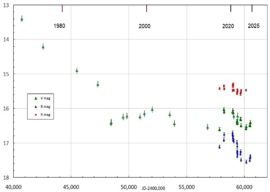 The next series of observations began in 1988. It turned out that the brightness of the object decreased by almost 2m in comparison with data from the 1970s (Figure 1 and Figure 2 and Table 1). The spectrum of the object showed emissions of HI, HeI, 5876, 6678, 7065 Å, [OIII], 4959 Å, 5007 Å and a faint line of [NII], 6583 Å. The level of the continuum was very low. The spectrum of the object was similar to that of a low-excitation planetary nebula [21,22]. Further observations showed that the emission lines of HI, [OIII] and HeI gradually weakened (Figure 3 and Figure 4), and [NII], 6583 Å line disappeared.