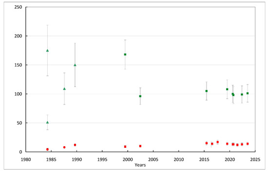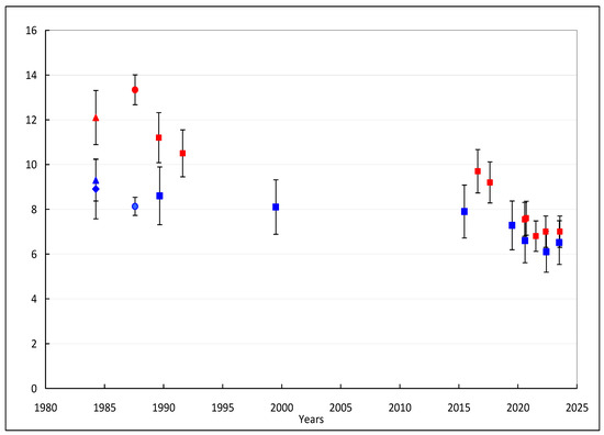 Fluxes in the Hβ line on a scale of 10−14 erg/cm2 s (blue signs) and fluxes in the Hα on a scale of 10−13 erg/cm2 s (red signs). Circles and triangles indicate values from the works [17,19,22]. Squares correspond to FAI data.