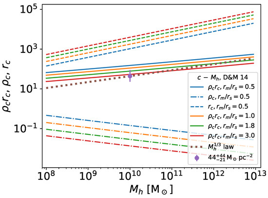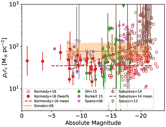 - Donato et al. (2009) [7]. The value with error bars is directly given in the paper. They conclude that the product is constant for absolute magnitudes from −7 to −22. In order to transform these B magnitudes into halo masses, (1) we use a stellar mass-to-light ratio of one (in solar units) and then use to estimate using the halo to stellar mass ratio at redshift zero from [27]. They use the same definition of the core radius as [4], and so it has to be corrected to ours in Equation (2).
