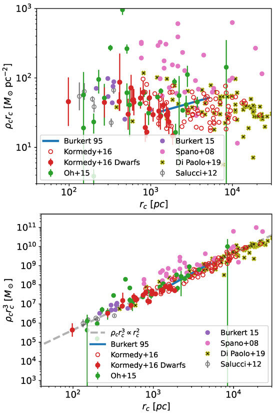 Figure 4 gives (top panel) and (bottom panel) versus . Note that the latter gives the DM mass in the core and it scales as following Equation (3), which is represented in the figure by the gray dashed line. These relations are independent of the uncertainties in .
