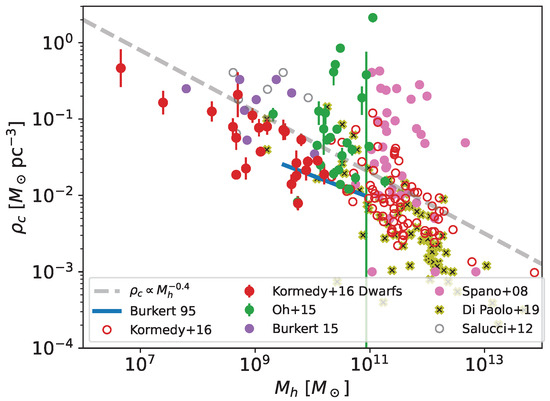 - Burkert (1995) [4] explicitly gives a relation between the central density and core radius and between the halo mass and core radius. Pieced together, they provide the relation represented in Figure 1 with within the range represented in his Figure 3. The original relations have to be corrected to our core radius definition (Equation (2)) and to the total halo mass (his Equation (4)).