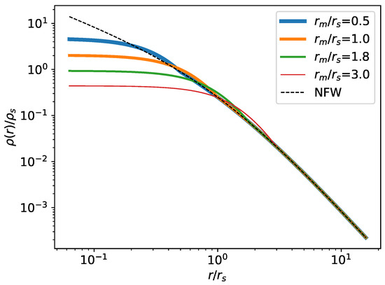 Examples of these cored DM profiles with NFW outskirts are given in Figure 6. This kind of piecewise shape has already been used in the literature, e.g., [29,30,31].