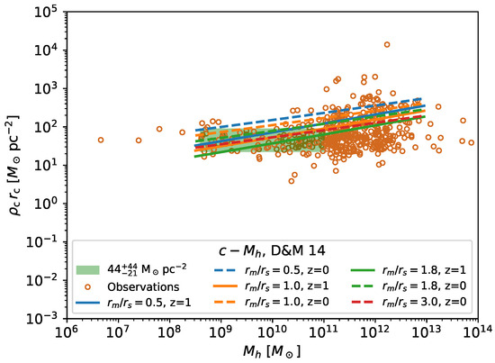 Figure 10 shows the observed (the symbols) compared with the prediction using the simple equations worked out in Section 3, where the DM cores are assumed to result from the redistribution of the mass of the CDM halos. The observed data points in Figure 10 are those in Figure 1 but shown in a range spanning the same eight orders of magnitude variation for both and . This particular scaling evidences how constant is, with the range of values in Equation (3) highlighted as the pale green region. The colored lines represent the theoretical predictions and they agree well with the observation without any fine tuning. They even reproduce a slight increase in with halo mass, which is probably too large in the theoretical model, although given the observational uncertainties one should not stress this fact further. Note that the prediction depends on the parameter and the redshift z from which the relation c– was taken. The best agreement with the observation corresponds to between 1 and 2 starting off from halos at , and between 0.5 and 1 starting from halos a bit earlier at . Figure 10 is based on the theoretical c– from [32], but the results are similar for the other theoretical c– analyzed in Section 2 and Figure 8 and Figure 9.