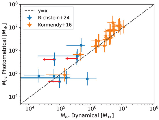 Comparison between the DM halo mass in the core of galaxies computed from the stellar velocity dispersion (horizontal axis) and from photometry alone as described by Equation (25) (vertical axis). The represented points include UFDs from Richstein+24 [37] and dSphs from Kormendy+16 [11]. The vertical error bars represent the dispersion in (Equation (3)) whereas the horizontal error bars account for the uncertainties in , as quoted in the original references. The one-to-one line is shown as a dashed black line. The red arrows point out upper limits in the dynamical DM halo masses.