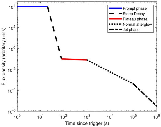 - Nousek, J.A.; Kouveliotou, C.; Grupe, D.; Page, K.L.; Granot, J.; Ramirez-Ruiz, E.; Patel, S.K.; Burrows, D.N.; Mangano, V.; Barthelmy, S.; et al. Evidence for a Canonical Gamma-Ray Burst Afterglow Light Curve in the Swift XRT Data. Astrophys. J. 2006, 642, 389–400. [Google Scholar] [CrossRef]