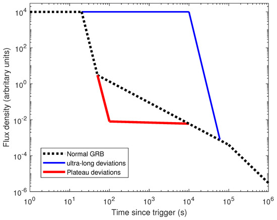 Schematic comparison of the light curves of a normal long GRB (dashed line) with the deviations caused by an ultra-long GRB (solid top line), and a GRB with a plateau phase (solid bottom line). For simplicity, the initial prompt and the late afterglow luminosities have been fixed to a common value. This simplification is not representative of the diversity of the observed fluxes for those events, but it enhances the difference between those three kind of events.