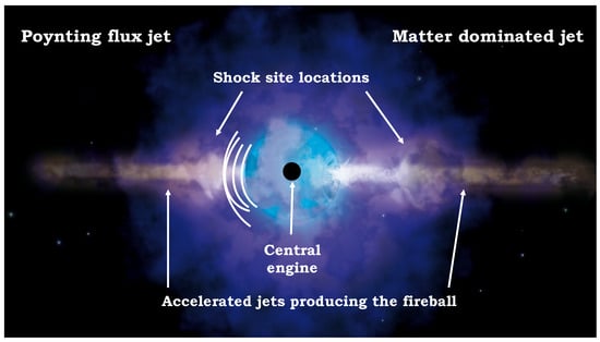 - Mészáros, P.; Rees, M.J. Poynting Jets from Black Holes and Cosmological Gamma-Ray Bursts. Astrophys. J. 1997, 482, L29. [Google Scholar] [CrossRef]