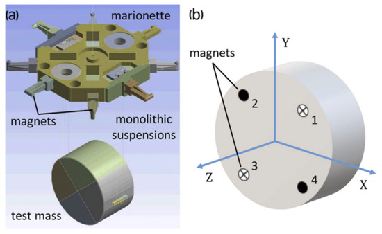 (a) Schematics of the last suspension stage of the Virgo TM, which includes the marionette with 8 actuation magnets, 4 fused silica suspension fibres, and the TM itself; (b) schematic view of the cross anti-parallel configuration of the 4 magnets glued on the Virgo TM [9].