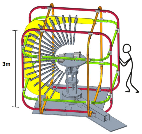 In blue, the two pairs of cylinders are arranged in a Helmholtz configuration. The radius is 2.05 m for the pair aligned along the x-axis and 2 m for the pair aligned along the y-axis.