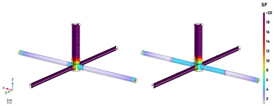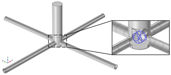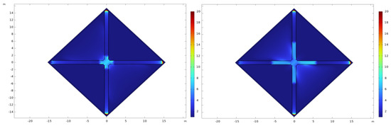 In a second configuration, the pairs of cylinders, still arranged in a Helmholtz configuration, are placed inside the tower (Figure 7). In this case, the radius of the pair aligned along the x-axis is 0.55 m while the radius of the pair aligned along the y-axis is 0.5 m.