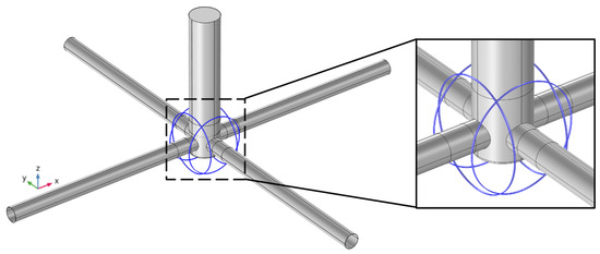 In the simulations, the two pairs of cylinders are arranged in a Helmholtz configuration, where the cylinders in each pair are separated by a distance equal to their respective radius (Figure 6). The radius is 2.05 m for the pair aligned along the x-axis and 2 m for the pair aligned along the y-axis. The radii of the two pairs must differ to avoid overlap between the cylinders.