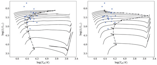 HR diagram comparison of Galactic B supergiants with solar metallicity [34] MESA model tracks with initial masses from 8–60 , in steps 8, 12, 15, 20, 25, 30, 35, 40, 45, 50, 55, 60 . The figure on the left-hand side is for a small amount of overshooting with = 0.1, while the figure on the right-hand side is for = 0.5. The dashed lines on both the left and right-hand side denote the TAMS location. The blue stars represent the observed B supergiant sample from Crowther et al. [22] with our updated luminosities utilising Gaia DR3 distances.