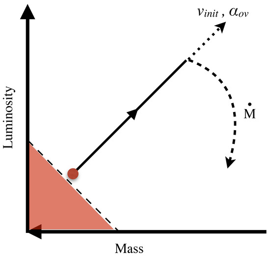 While asteroseismology could potentially constrain the core sizes of stars, up to today results have only been obtained up to a mass of around 20 , delivering a rather wide range in observed from 0–0.4 [41] (see Table 1). For more massive stars other methods such as the study of eclipsing binaries becomes relevant, see [42,43]. Still, only using traditional tools, such as the stellar HR diagram is not sufficient to disentangle the various physical ingredients. Higgins & Vink [34] have shown how vectors in the mass-luminosity plane, with mixing elongating the vector, and mass loss changing the vector’s angle, see Figure 2 could be used instead.