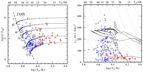 Luminosities (Left-hand side) and rotational velocities (right-hand side) versus effective temperature from the VLT Flames survey of massive stars for evolutionary masses over 15 . Luminosity classes are represented by blue plus signs (for luminosity classes II–V) and red stars (for luminosity class I). The evolutionary tracks for LMC metallicity (50% solar), including the predicted bi-stability jump, are shown in grey, with initial rotation velocities of 250 km/s for five masses: 15, 20, 30, 40, and 60 . Note that the critical mass for bi-stability braking is approximately 35 at LMC metallicity in these specific models computed with the BONN stellar evolution code for a step overshooting value of = 0.5. The rotational velocity tracks can be compared to the angular momentum conservation case, depicted as grey dotted background lines, showing that bi-stability braking can be steeper than would be attributable to angular momentum conservation. The black dots along the evolutionary tracks correspond to year time-steps. Adapted from Vink et al. [20].