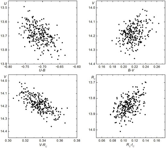 - Chalenko, N.N. Application of theoretical UBVRI color-color diagrams to colorimetric analyses of various astrophysical objects. Astron. Rep. 1999, 43, 459–461. [Google Scholar]