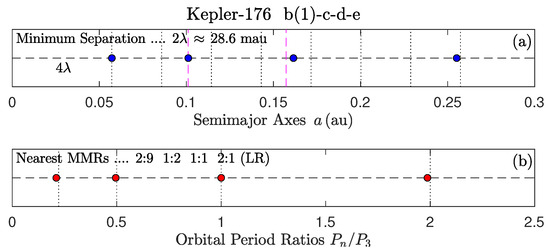Kepler-176: (a) Distribution of semimajor axes of planets (filled blue circles) and nearest radial tidal potential minima (vertical dotted lines separated by a distance of , where mau is the wavelength of the tidal field). Equations (10) and (12) of Paper I predict that mau for planet d and mau for planet b. The vertical dashed lines split the particular intervals into equal segments. (b) Distribution of orbital period ratios of planets (filled red circles) and nearest global MMRs (vertical dotted lines). The orbits deviate from the nearby exact MMRs by ≤ 1.6%. Planet d () is the most massive within the LR ( [58]); it is taken to be orbiting at the 1:1 MMR for illustration purposes.