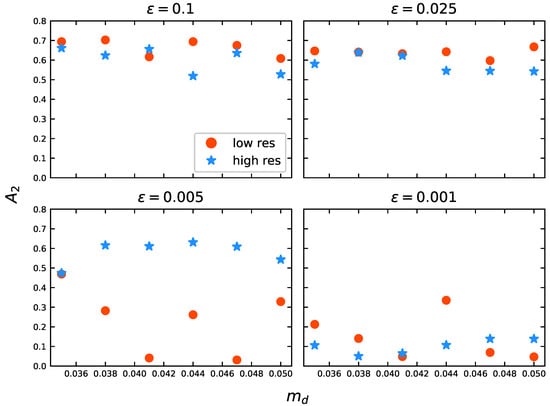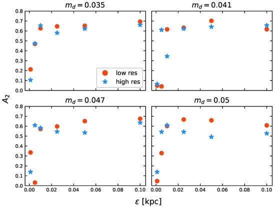 - We are also able to conclude that, for particle resolutions close to , softening values lower than 0.005 kpc are not well-suited to reproduce the bar instability. However, this depends on the disc mass fraction. If , the bar appears to cohabit with numerical noise introduced by small softening values, specifically, kpc. Models with lower values (0.040) are not able to overcome the interference of small softening values, affecting the behaviour of the bar (see Figure 12).