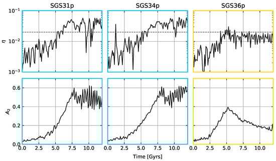 - Further evolution of Toomre’s criterion does not reflect bar instability for all of our models, particularly for models with the lowest softening values, i.e., kpc (see Section 2.3). This behaviour still occurs after increasing the number of particles of the models.