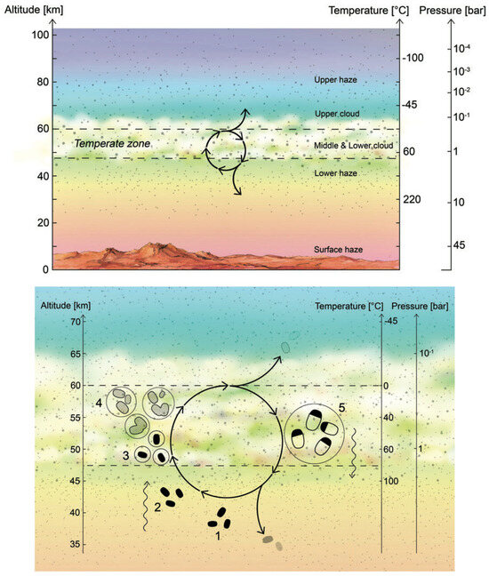Hypothetical life cycle of the Venusian microorganisms. (Top panel) Cloud cover on Venus is permanent and continuous, with the middle and lower cloud layers at temperatures that are suitable for life. (Bottom panel) Cycle for Venusian aerial microbial life; see text for details. Taken from Ref. [15].