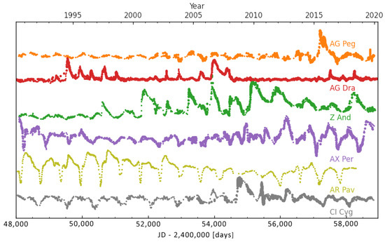 The orbital periods of known symbiotic systems span from several hundred to thousands of days. Excluding the exceptionally long orbital periods of D-type symbiotics, systems that host highly evolved large red giants that typically pulsate as Miras, the more common S-type symbiotic stars exhibit orbital period distributions peaking between 500 and 600 days. The red giants in symbiotic systems typically undergo semi-regular pulsations with periods ranging from approximately 40 to 200 days, while Mira-type pulsators exhibit longer pulsation periods, often spanning several hundred days, e.g., [13,113,114]. Furthermore, symbiotic binaries can undergo prolonged episodes of activity, including recurrent Z And-type outbursts and “slow” symbiotic nova eruptions, which may persist for decades. Given these characteristic timescales, analyzing the variability of symbiotic stars requires extensive long-term time-series observations (see Figure 2).