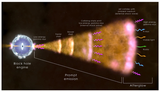 GRBs are among the most luminous and energetic phenomena observable in the Universe. They arise as a prompt emission in the keV-MeV energy bands, followed by an afterglow emission, the latter of which spreads its power over longer wavelengths (see Figure 1 for a schematic representation of GRB components). The prompt emission usually lasts from a few seconds up to minutes and is bimodally distributed, identifying two classes of GRBs—long GRBs (LGRBs) and short GRBs (SGRBs) [1]—depending on whether their duration is shorter or longer than 2 s (see also Section 2.1).
