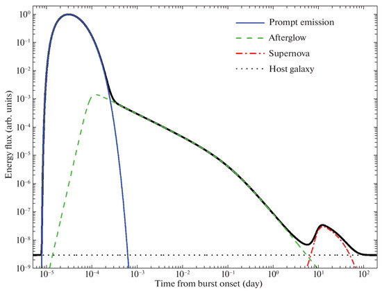 Different components of the optical light curve of an LGRB with an associated SN. Different contributions are labeled in the top-right corner. This figure (Figure 8 in the original paper) from [19] was reproduced with permission from Springer Nature.