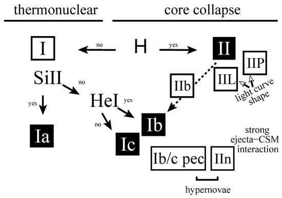 SN classification tree distinguishing between thermonuclear and core-collapse SN explosions. This figure from [122] (Figure 1 in the original paper) was reproduced with permission from Springer Nature.