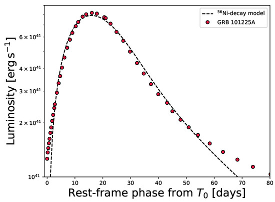 The bolometric () light curve of the GRB 101225A SN fitted with a 56Ni decay-powered diffusion scheme (dashed black lines). The original multiband light curves were taken from Thöne et al. [84] and integrated to obtain the bolometric light curve (red dots) assuming a distance of 1.6 Gpc, then corrected for time delay.