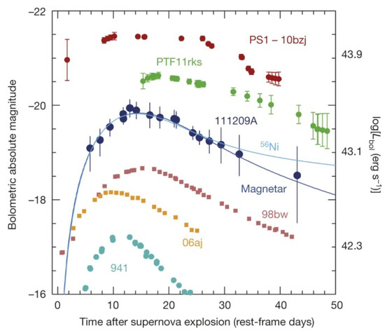 A growing number of astrophysical objects have been putatively interpreted with the contribution of NSs. Due to their flexibility in modeling even very diverse and often exotic phenomena, they deserve the reputation of a “patch” to unravel many otherwise unsolvable riddles of modern astrophysics, like soft gamma repeaters [209]; ultraluminous X-ray pulsars [210]; fast radio bursts [211]; and, not least, SLSNe and GRBs. The link between massive, non-degenerate stars and NSs was very well established by classical stellar evolution theories, and invoking their contribution is fully reasonable from an astrophysical perspective. Magnetars are highly magnetized NSs, which means that their magnetic-field strength (B) exceeds the quantum critical field (, where is the electron mass, c is the speed of light in vacuum and ℏ is the reduced Planck constant). This value corresponds to the magnetic field for which the cyclotron energy equals the rest of the energy of the electron. Even if created during the core collapse of a massive star, such magnetic-field values likely require the invocation of a magnetic-field amplification mechanism instead of more conventionally assuming magnetic flux conservation during the core collapse for typical values of the progenitor magnetic field16. Possible B-field amplification mechanisms consider the formation of a proto-NS (PNS) with periods between ∼0.6 ms and 3 ms [93]. In this scenario, the strong magnetic field experienced by magnetars is thought to result from an amplification process caused by convection and differential rotation in such rapidly rotating stars (e.g., [93,215,216,217]).