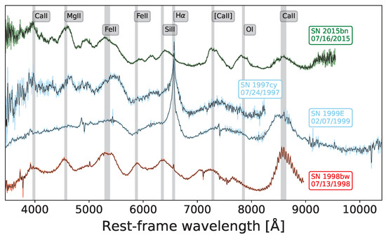 - Hook, I.M.; Howell, D.A.; Aldering, G.; Amanullah, R.; Burns, M.S.; Conley, A.; Deustua, S.E.; Ellis, R.; Fabbro, S.; Fadeyev, V.; et al. Spectra of High-Redshift Type Ia Supernovae and a Comparison with Their Low-Redshift Counterparts. Astron. J. 2005, 130, 2788–2803. [Google Scholar] [CrossRef]