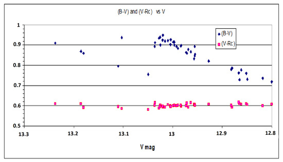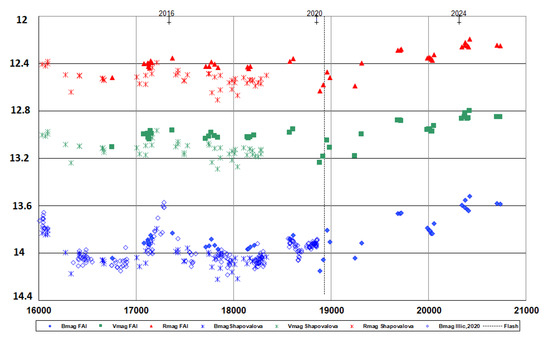 The light curve in Figure 1 presents the results of the measurements obtained between 2014 and 2025 and supplemented by the results from [2,6]. The errors of B, V, and magnitudes do not exceed mag.