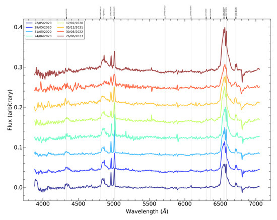The spectra of NGC 3516 in the spectral range Å to Å are presented in arbitrary units and shifted along the Y-axis for profile comparison (Figure 3). It was noted that on 22 May 2020, the spectrum presents prominent narrow resolved emission lines [FeVII] 5721 Å, 6087 Å. These coronal emission lines probably originate from the inner region, and for their creation, most likely a hot X-ray wind is needed [25,26,27].
