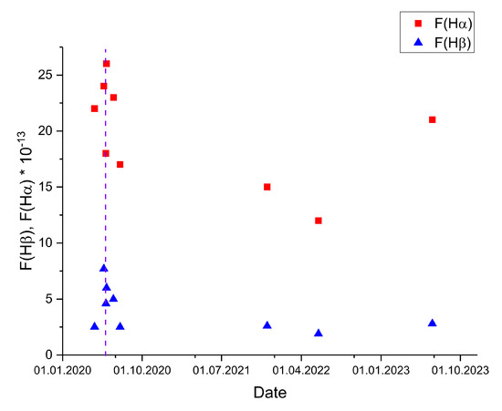 We have visualized the change in the fluxes of the H+[NII] and H lines in Figure 5, which allows us to trace their variations over time.