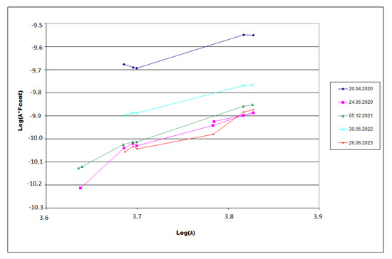 For a quantitative assessment of the broad-line region (BLR) size at different epochs, we calculated the continuum luminosity at Å (L5100), adopting a luminosity distance to NGC 3516 of Mpc, and applied the empirical R–L relation from Bentz et al. [28]. The results are summarized in Table 3. The characteristic size of the BLR varies between approximately 0.13 and 0.20 light-days across different observational epochs. The largest value was obtained in April 2020 (0.20 light-days), corresponding to the period of enhanced continuum luminosity. A slight increase in R is observed again in 2023, which matches a higher (though not maximum) SED position in Figure 6. By June 2023, a gradual decrease in to 0.13 light-days is observed, corresponding to a decline in continuum flux and the evolution of the spectral energy distribution.