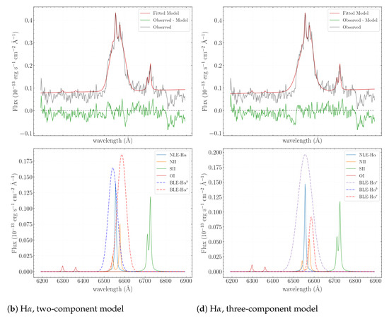 For the H range, the three-component model is preferred over the two-component model for describing the BLE profile, as = , indicating that the three-component model is 16 times more likely than the two-component one. For the H range, the two- and three-component models exhibit similar statistical significance (). The three-component model was chosen for consistency, considering the noise level and uncertainties. All approximations for the NLE lines used a Voigt profile, while the BLE lines were modeled with either a two- or three-component Gauss profile. The high noise level in this region prevents us from having a precise measurement of H velocity dispersion used for Black Hole mass estimation.