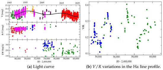 Analysis of our collection of photometric data (see Table 2 for the time coverage and statistics) revealed even a longer cycle of ∼20 years (see the upper left panel of Figure 1). Although the time frame between 2003 and 2015 has a scarce coverage, two local brightness maxima around 1995 and 2017 as well as three minima near 1987, 2007, and 2024 are noticeable. There is also a hint of a gradual fading (minima ∼11 mag near 1987 and ∼11.2 mag near 2024, maxima ∼10.2 mag near 1999 and ∼10.4 mag near 2017), but this may be due to irregular monitoring before 1999. At the same time, the () color-index changed very slightly and showed a modest increase between 1986 and 2015 along with a smaller variation amplitude compared to that in the V-band.