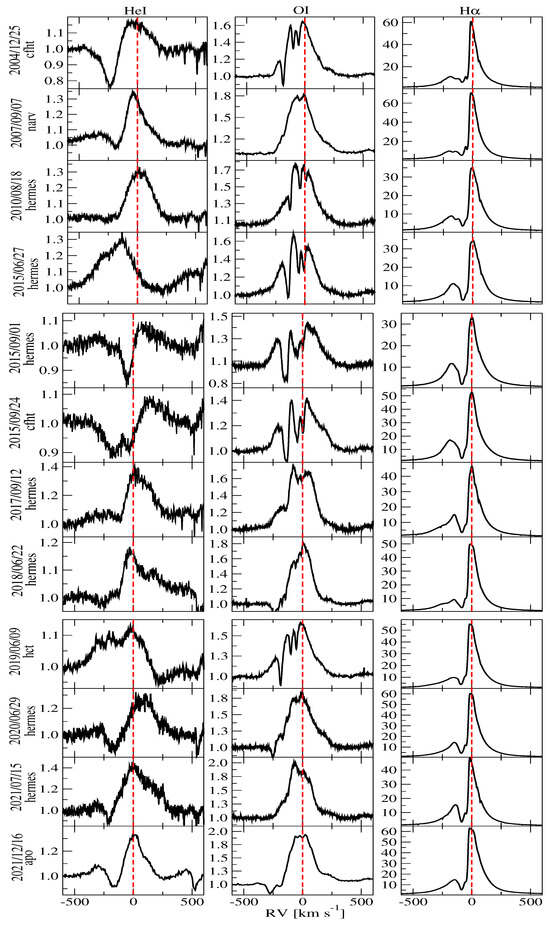 From left to right: Profiles of the He i (5875 Å), O i (7771/7774/7775 Å), and H (6563 Å) lines. The vertical red dotted lines show the stationary positions of the spectral lines; however, for the oxygen line, the average wavelength of the three lines is given. The horizontal axis shows heliocentric RVs on km , and the vertical axis shows the line intensity in units of the local continuum.